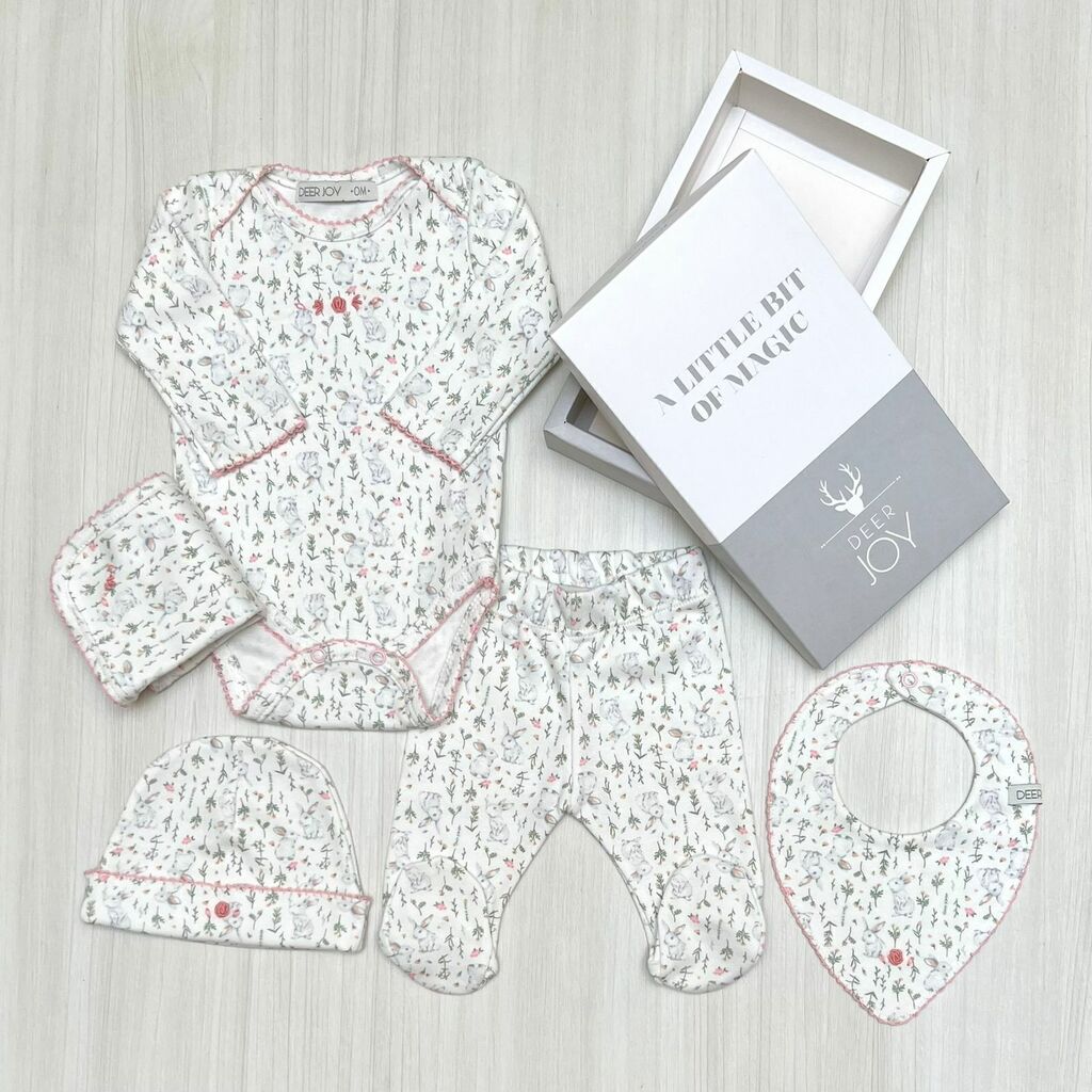 Ajuar para recién nacido esta confeccionado en algodón. Viene en una cajita de 5 piezas, con body, babero, gorrito y babita con terminación de picot.