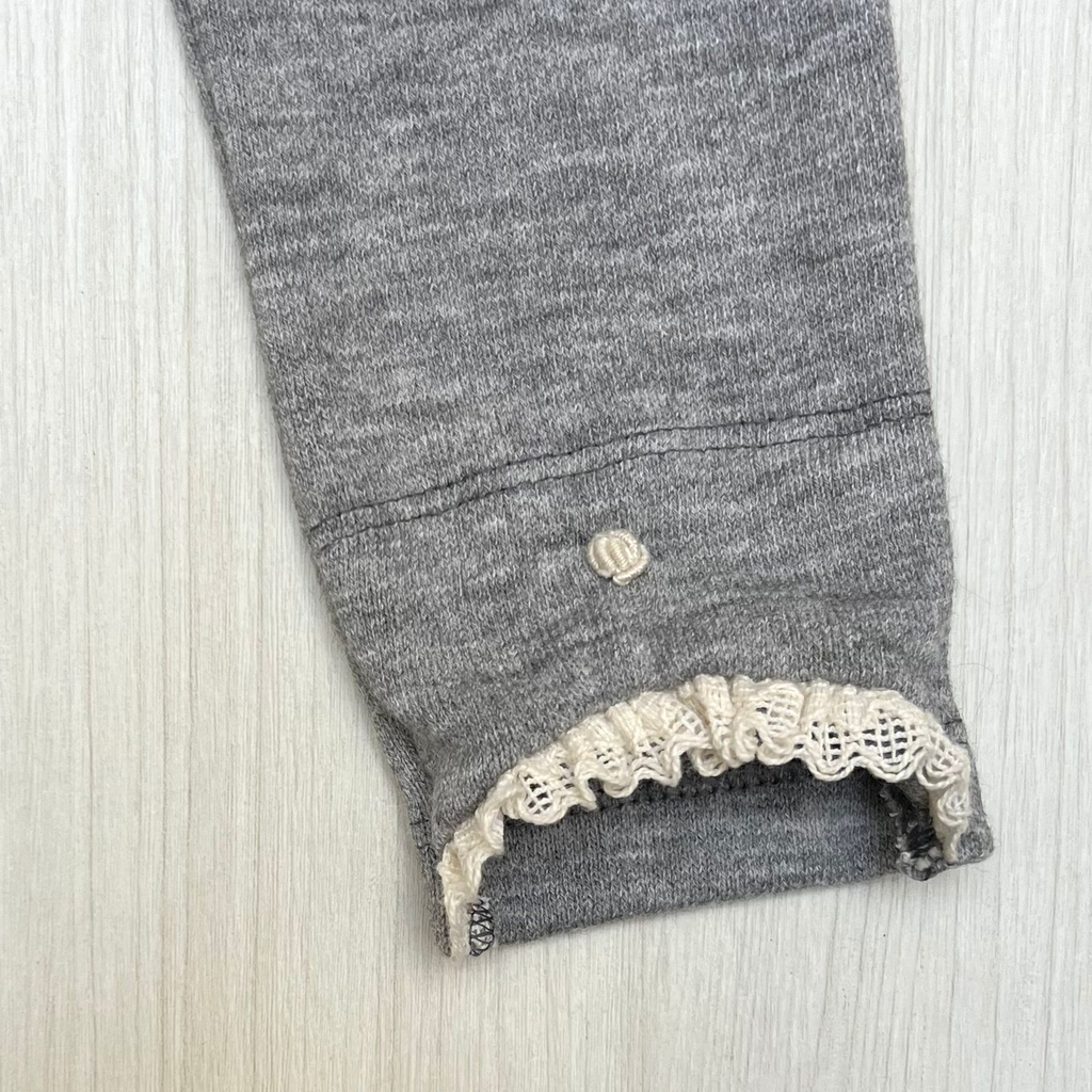 La calza LUNA esta confeccionado en lanilla con spandex. Posee elástico en cintura. Detalle de cordón crudo en delantera, en la botamanga posee puntilla fruncida y una flor bordada a mano.