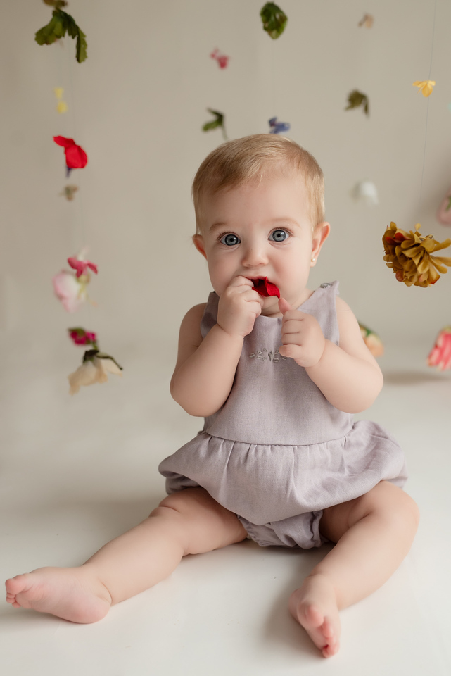 El enterito OLI está confeccionado en lino, con un bordado delicado en el centro. Tiene snaps pañaleros en entrepierna, botón en la espalda y en sus hombros para que sea más fácil cambiarlos.