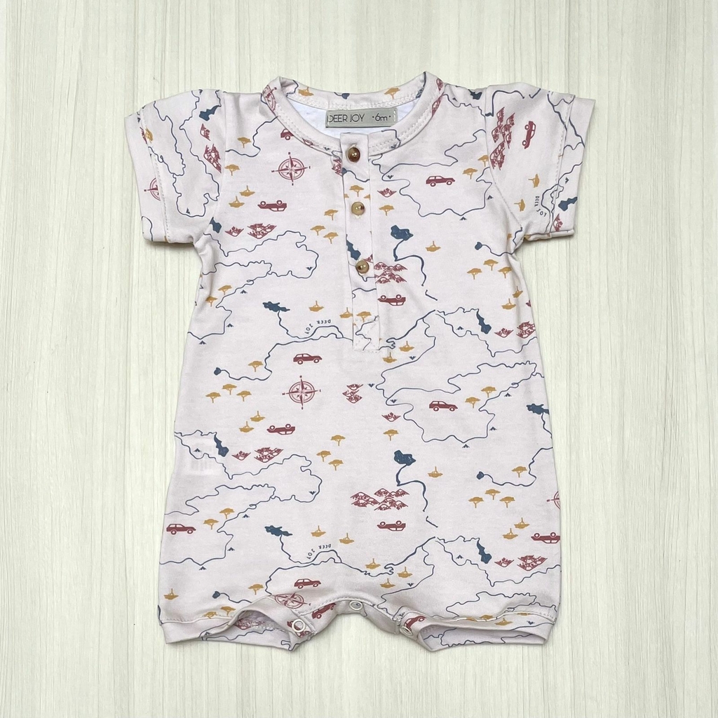 El enterito POLO es de algodón con estampa de la cápsula "DEER PRINTS". Su acceso es por su cartera delantera con botones. Posee broches en entrepierna.
