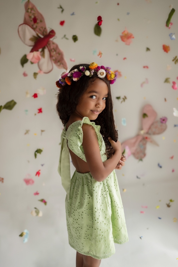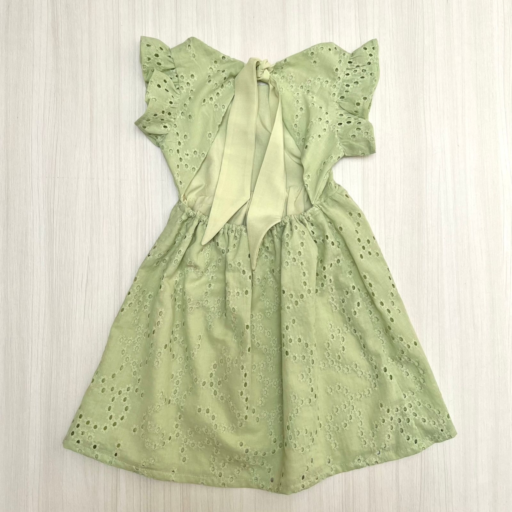 El vestido esta confeccionado en broderie de algodón y forrado en voile. Posee volados en sus hombros. Su falda esta fruncida lo cual hace que la prenda tenga mucho vueloy su espalda es descubierta con tiras para atar.